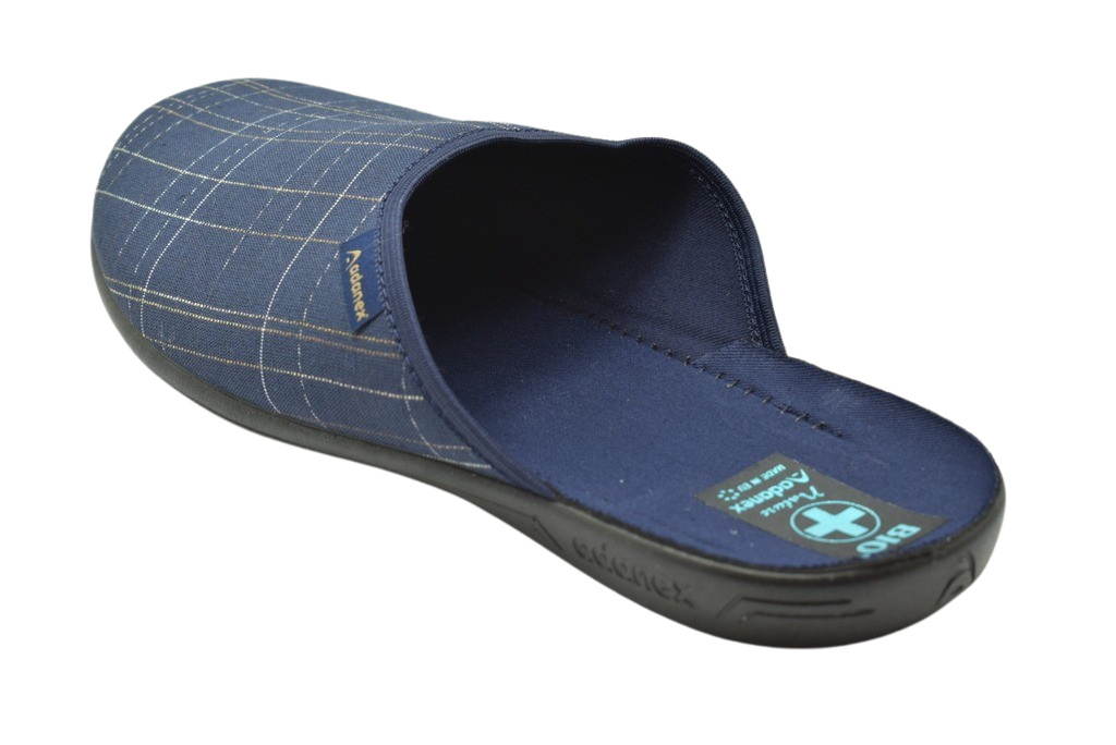 Klapki męskie firmy ADANEX, wysokie w palcach. Wykonane są z naturalnych tkanin, płótno. Spody typu BIO lekko profilowane, lekkie i elastyczne.