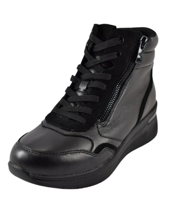 Ciepłe botki marki Caprice. Z zewnątrz wykonane są ze skóry naturalnej i materiał w przedniej części buta, wewnątrz obuwia znajduje się ocieplenie kożuchem oraz skóra naturalna. Wkładka jest również ocieplona kożuchem. Podeszwa to wysokogatunkowe tworzywo. Botki posiadają dwa czynne suwaki i dodatkowo sznurówkę. Obuwie o poszerzonej tęgości - H.