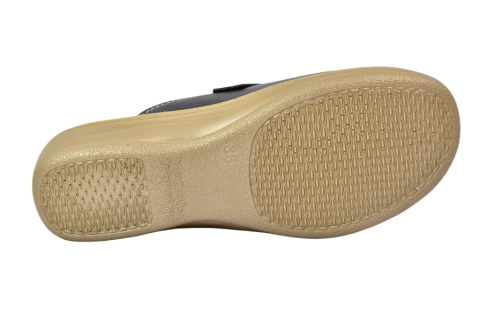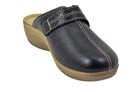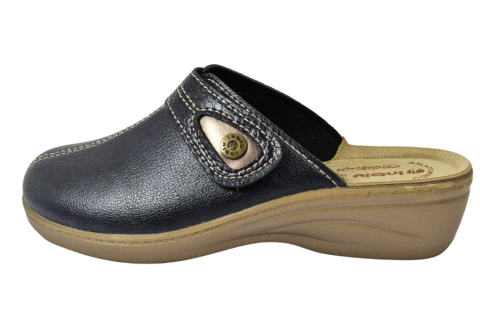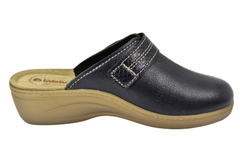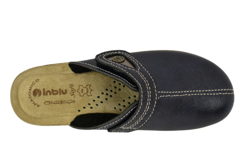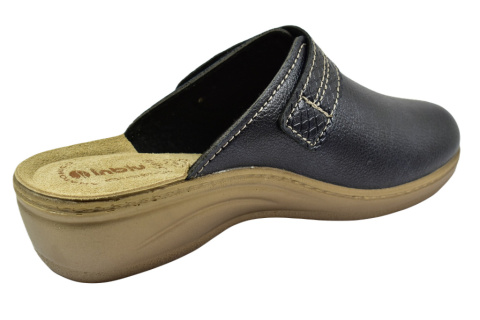 Klapki marki Inblu. Z zewnątrz wykonane są z materiału obuwniczego, wewnątrz znajduje się tkanina oraz miękka wkładka ze skóry naturalnej. Podeszwa składa się z wysokogatunkowego tworzywa. Posiada rzepę i niewielki koturn - 4 cm.