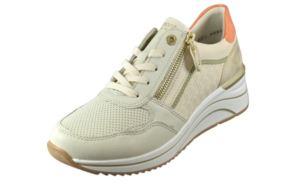 Adidasy damskie na koturnie firmy REMONTE. Wykonane ze skóry i na czubku i pięcie buta materiał skóropdobny, miękka, wyjmowana wkładka została wykonana w technologii 'SOFT'. Regulowane na sznurówkę, która pozwala na dopasowanie wyższego podbicia czy opuchlizny jak i na suwak, który ułatwia wkładanie obuwia. Wysokość koturny - 5 cm.
