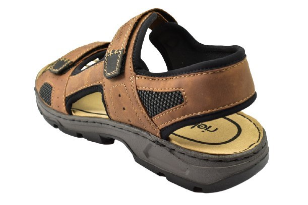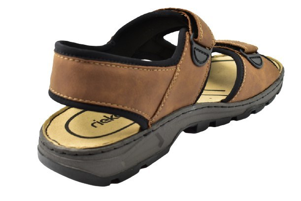 Sandały męskie firmy RIEKER. Z zewnątrz wykonane ze skóry, wewnątrz znajduje się miękki materiał oraz skórzana i profilowana wkładka. Regulacja na trzy rzepy. Antypoślizgowa podeszwa.