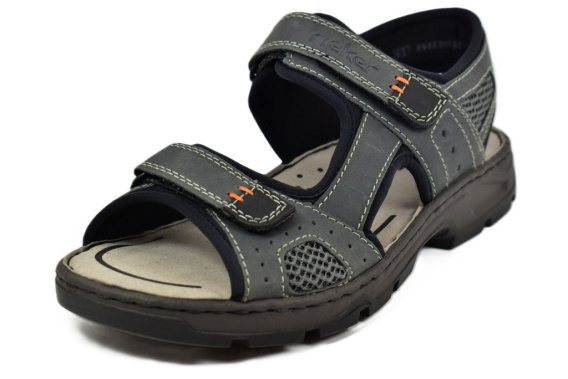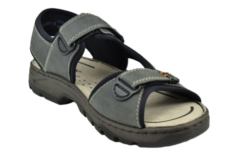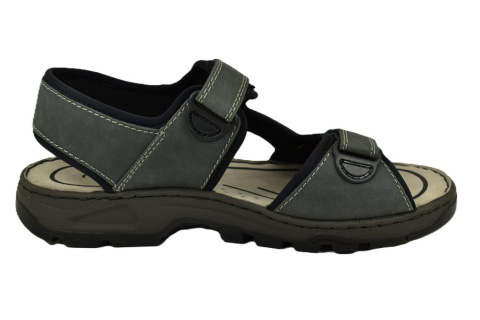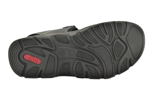 Sandały męskie firmy RIEKER. Z zewnątrz wykonane ze skóry, wewnątrz znajduje się miękki materiał oraz skórzana i profilowana wkładka. Regulacja na trzy rzepy. Antypoślizgowa podeszwa.