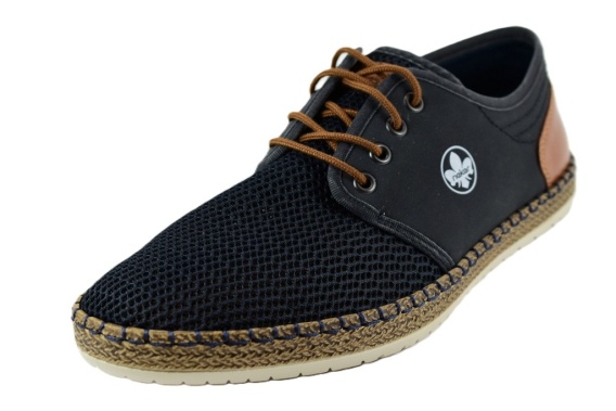 Półbuty męskie, sznurowane z siatką w przedniej części, firmy RIEKER. Z zewnątrz wykonane ze materiłu ekologicznego, wewnątrz znajduje się materiał ekologiczny, a miękka wkładka jest skórzana. Podeszwa to wysokogatunkowe tworzywo.