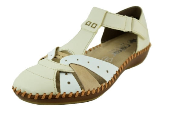 Półbuty dziurkowane firmy Rieker. Materiał zewnętrzny jest skóra, a wewnątrz miękka skórzana wkładka. Podeszwa to wysokogatunkowe tworzywo. Obuwie regulowane na rzepę dla wygodniejszego wkładania obuwia. Miękki lekki kauczkowy spód.