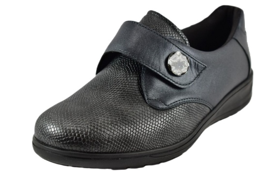Półbuty marki Solidus, o poszerzonej tęgości - M (dla stóp bardzo szerokich). Z zewnątrz wykonane są ze skóry naturalnej, wewnątrz obuwia znajduje się tkanina oraz wyjmowana i profilowana wkładka. Podeszwa jest z wysokogatunkowego tworzywa. Półbuty zapinane są na rzepę.
