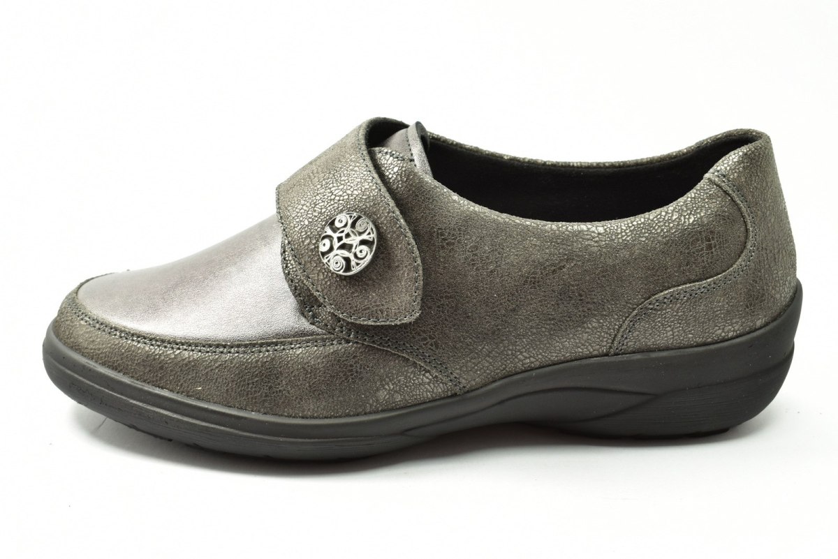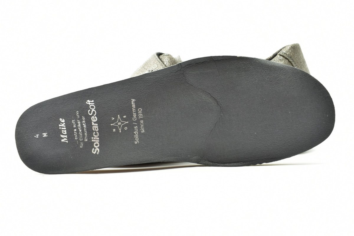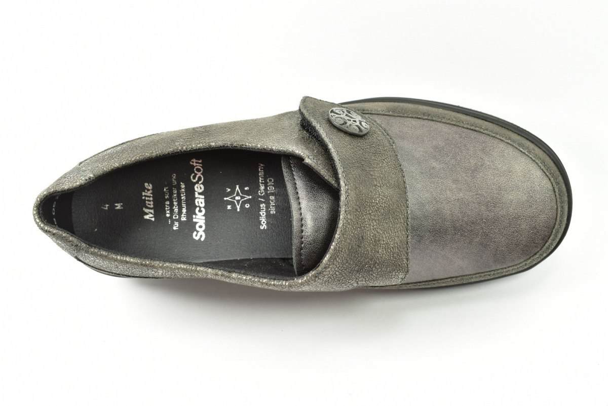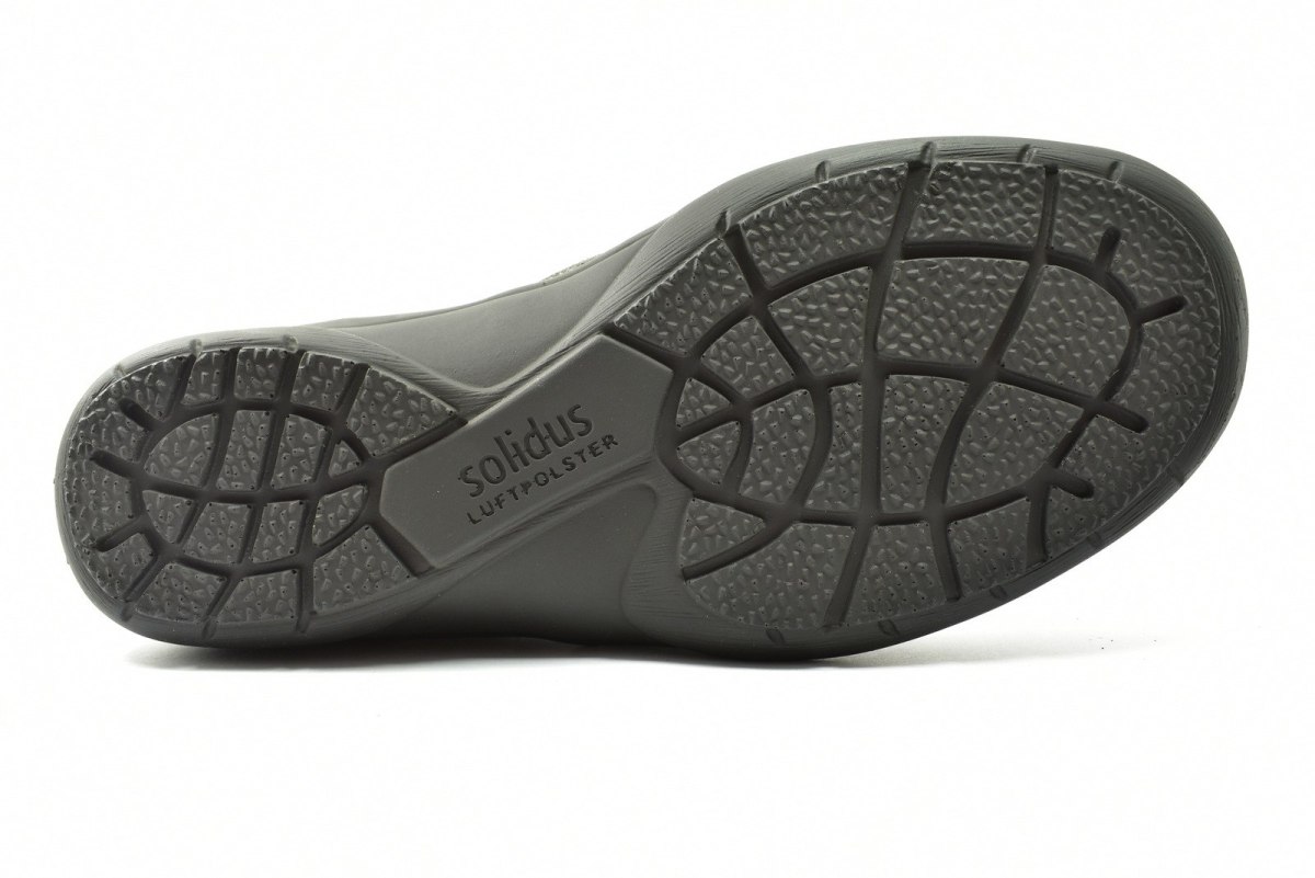 Półbuty marki Solidus, o poszerzonej tęgości - M (dla stóp bardzo szerokich, skłonnych do opuchnięć). Z zewnątrz wykonane są ze skóry naturalnej, wewnątrz obuwia znajduje się tkanina oraz wyjmowana i profilowana wkładka. Podeszwa jest z wysokogatunkowego tworzywa. Półbuty zapinane są na rzepę.