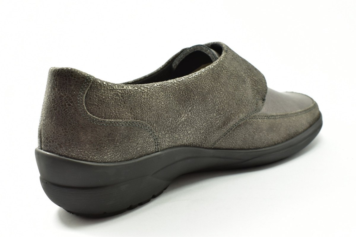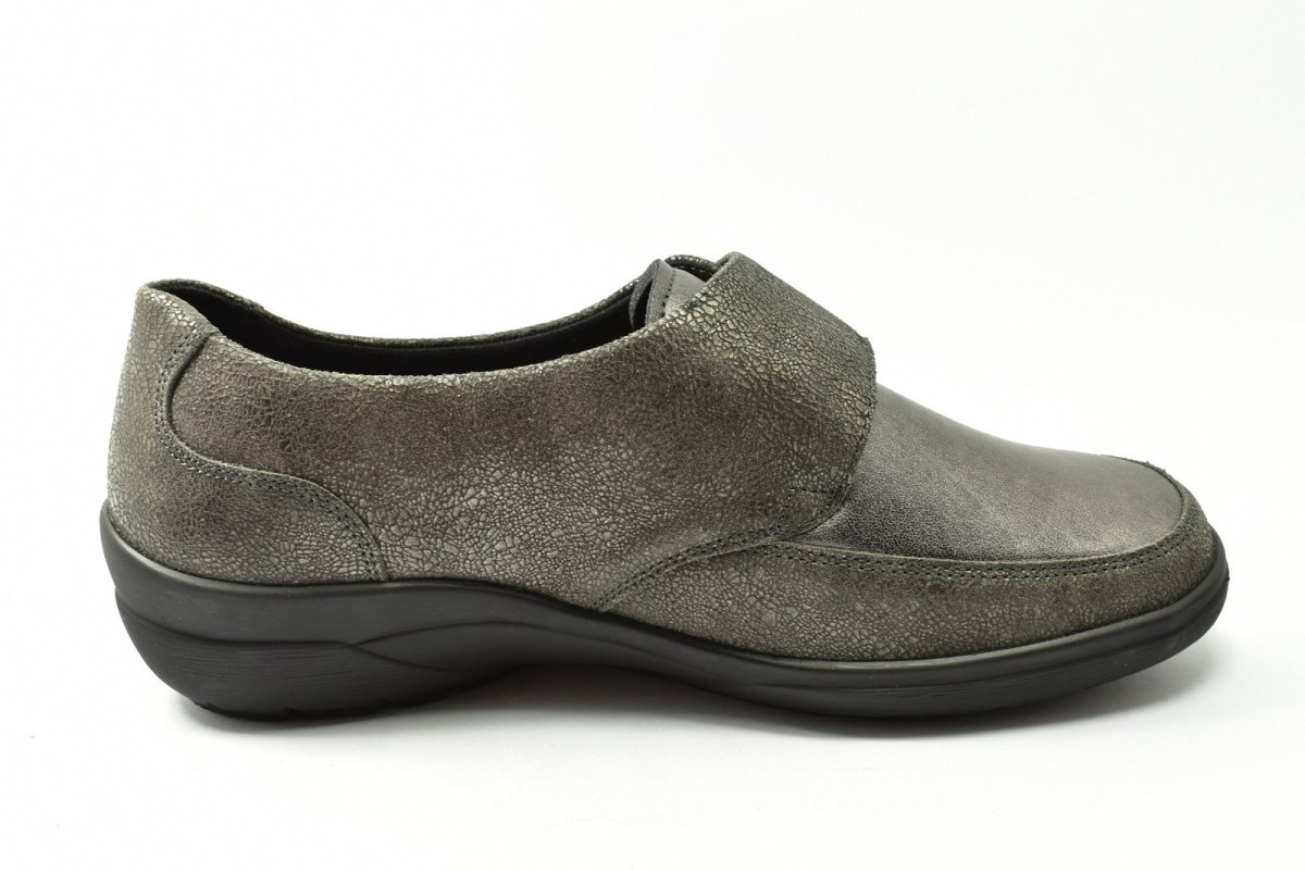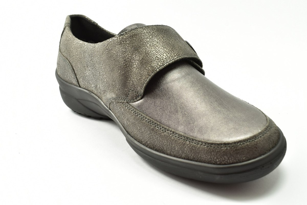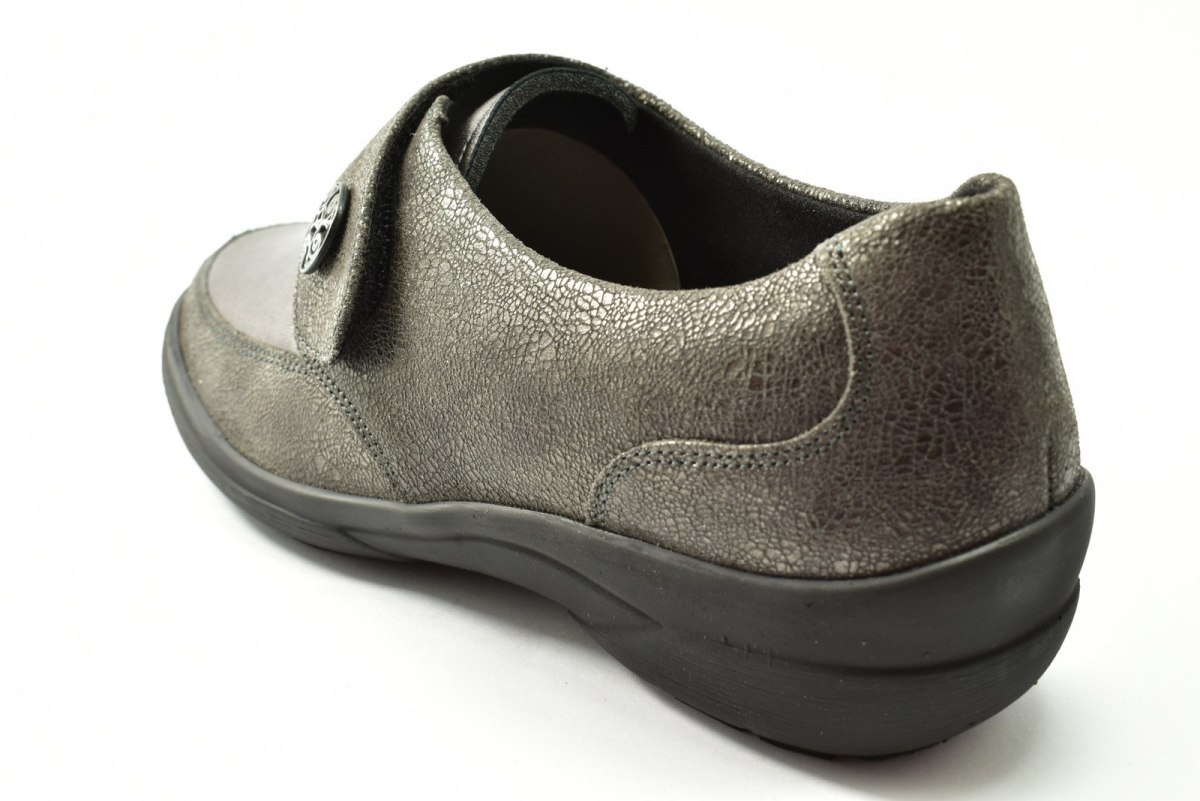 Półbuty marki Solidus, o poszerzonej tęgości - M (dla stóp bardzo szerokich, skłonnych do opuchnięć). Z zewnątrz wykonane są ze skóry naturalnej, wewnątrz obuwia znajduje się tkanina oraz wyjmowana i profilowana wkładka. Podeszwa jest z wysokogatunkowego tworzywa. Półbuty zapinane są na rzepę.