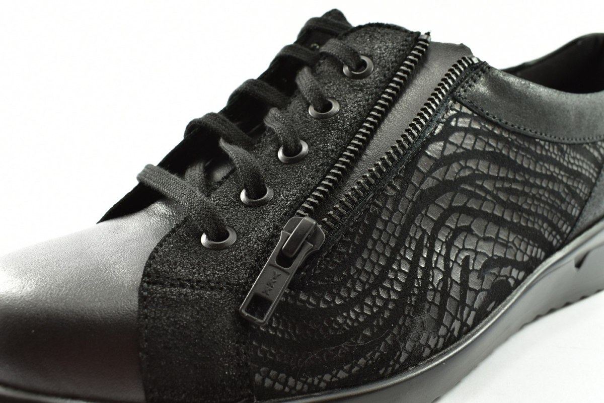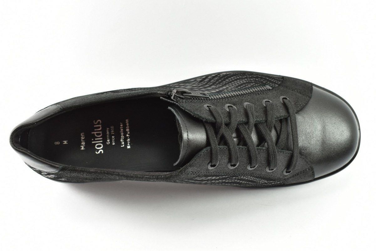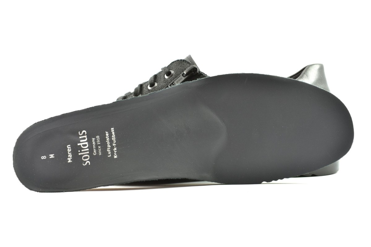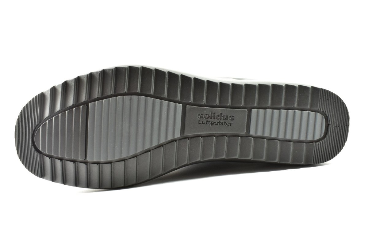 Półbuty marki Solidus, o poszerzonej tęgości - M. Z zewnątrz wykonane są ze skóry naturalnej, z lekkim połyskiem. Wewnątrz obuwia znajduje się skóra oraz miękka tkanina. Wkładka profilowana z pelotą na płaskostopie podłużne i poprzeczne. Dodatkowo amortyzacja na piętę. Podeszwa jest z wysokogatunkowego tworzywa. Półbuty regulowane na sznurówki i dodatkowy suwak.