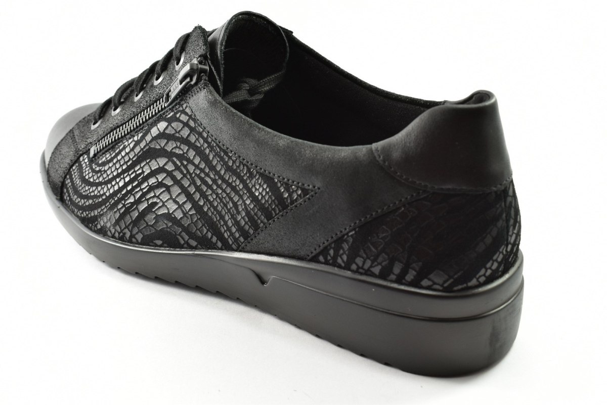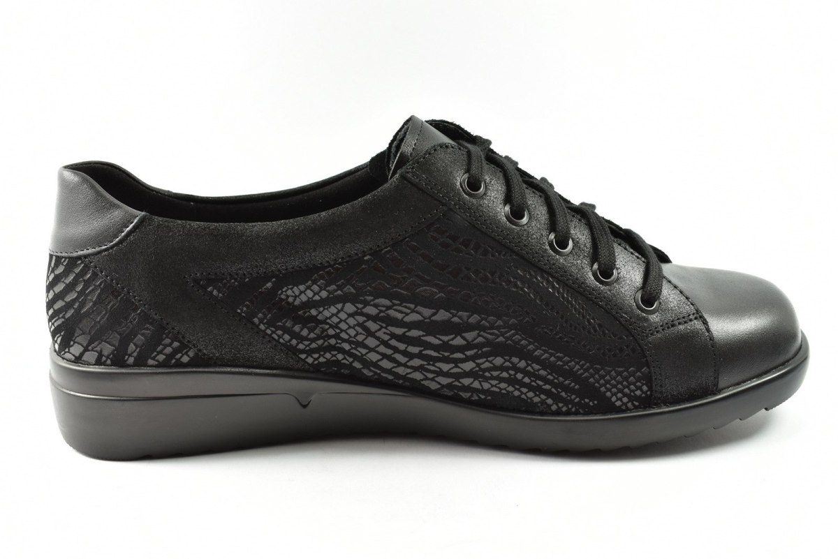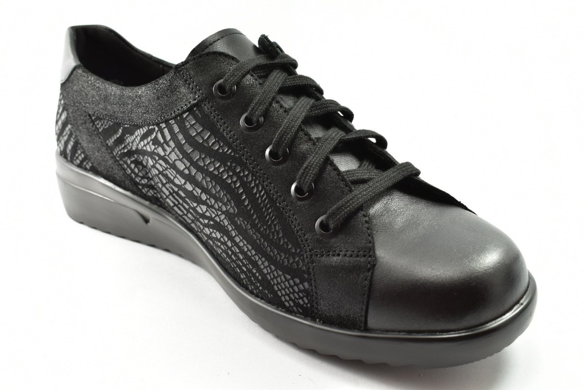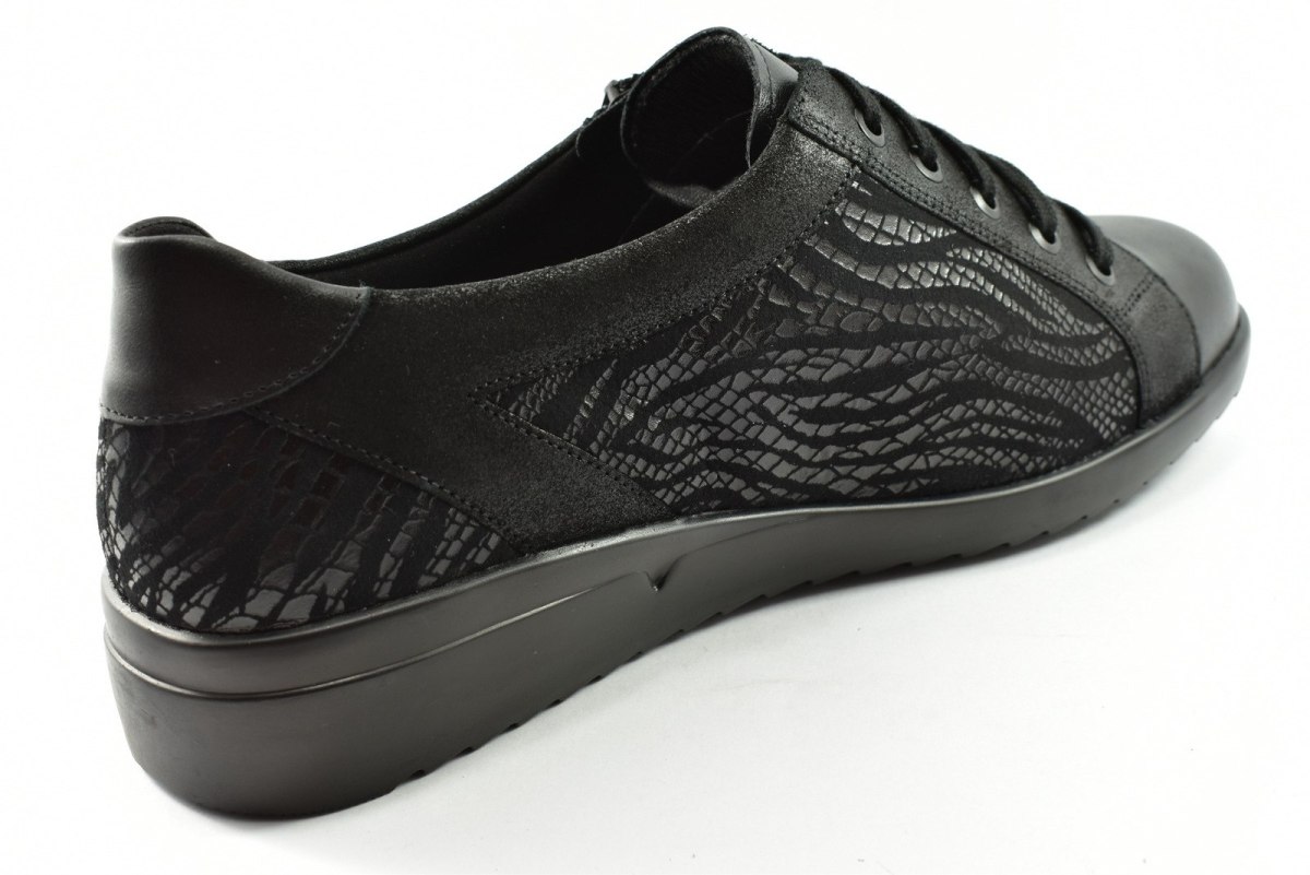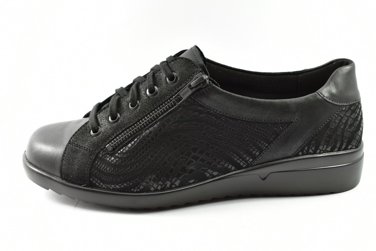 Półbuty marki Solidus, o poszerzonej tęgości - M. Z zewnątrz wykonane są ze skóry naturalnej, z lekkim połyskiem. Wewnątrz obuwia znajduje się skóra oraz miękka tkanina. Wkładka profilowana z pelotą na płaskostopie podłużne i poprzeczne. Dodatkowo amortyzacja na piętę. Podeszwa jest z wysokogatunkowego tworzywa. Półbuty regulowane na sznurówki i dodatkowy suwak.