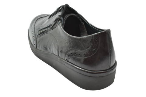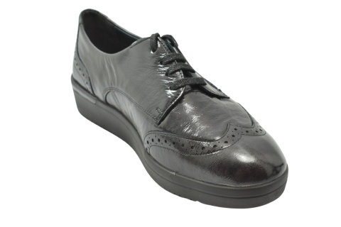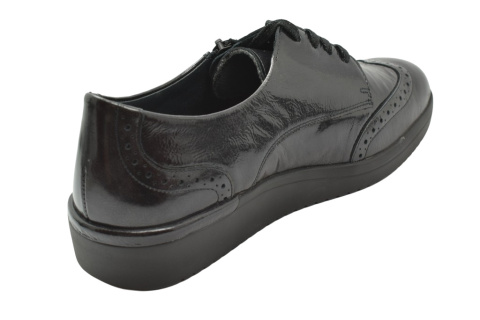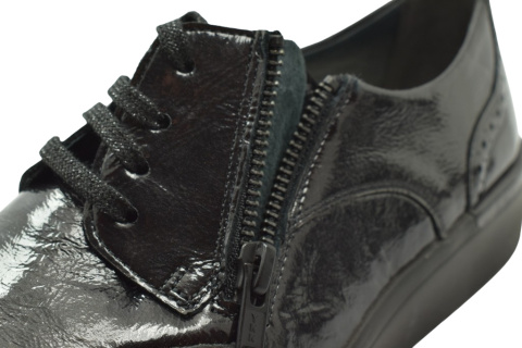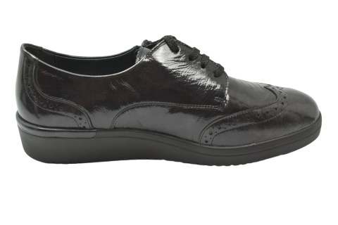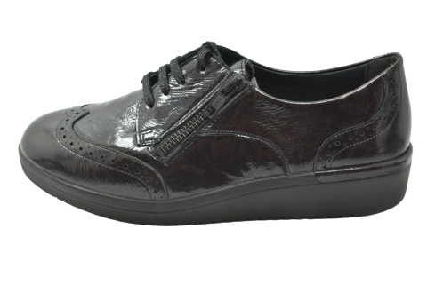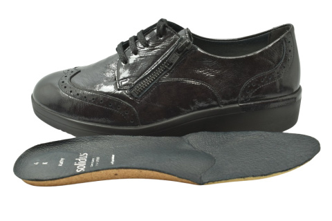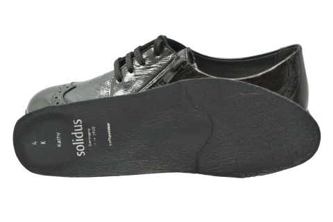 Półbuty marki Solidus, o poszerzonej tęgości - K. Z zewnątrz wykonane są ze skóry naturalnej, lakierowanej. Wewnątrz obuwia znajduje się miękka skóra plus materiał w przedniej części buta, a wkładka jest profilowana i wyjmowana, z pelotą na płaskostopie podłużne i poprzeczne. Dodatkowo amortyzacja na piętę. Podeszwa jest z wysokogatunkowego tworzywa. Półbuty regulowane na sznurówki i dla ułatwienia wkładania suwakiem.