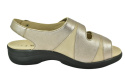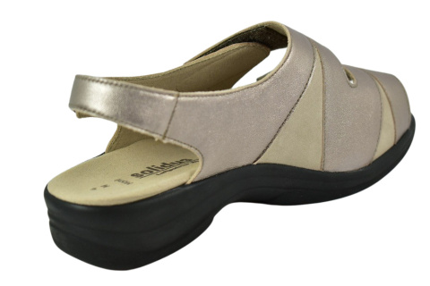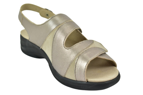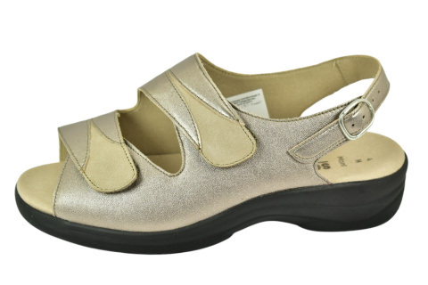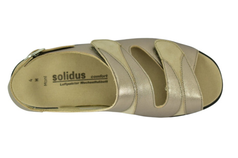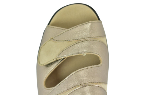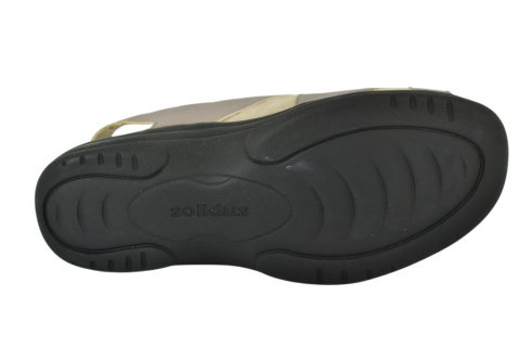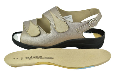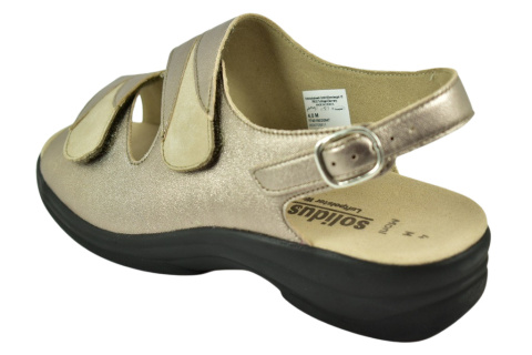 Sandały marki Solidus, o poszerzonej tęgości - M (na bardzo spuchnięte i nabrzmiałe stopy). Z zewnątrz wykonane są ze skóry naturalnej, lakierowanej. Wewnątrz obuwia znajduje się miękki materiał obuwniczy, a wkładka jest profilowana i wyjmowana, z pelotą na płaskostopie podłużne i poprzeczne. Dodatkowo amortyzacja na piętę. Podeszwa jest z wysokogatunkowego tworzywa. Półbuty regulowane na dwa rzepy i dla ułatwienia dopasowania klamerka na pięcie.