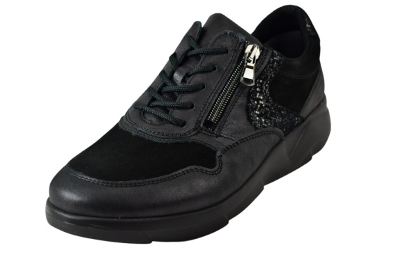 Propozycja marki Waldlaufer, to wygodne i bardzo lekkie półbuty na suwak i sznurówkę. Z zewnątrz wykonane są ze skóry licowej i nubuk nabłyszczany, wewnątrz skóra w przedniej i tylniej części buta znajduje się tkanina. Wkładka skórzana, jest wyprofilowana i wyjmowana. Posiada punkt amortyzujący piętę. Podeszwa to wysokogatunkowe tworzywo. Obuwie o poszerzonej tęgości - K na duże haluksy i wysokie podbicie.